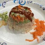 • To assemble, take a 1/2 cup measuring cup and sprinkle sesame seeds into the bottom if desired. Next, layer 1/3 of the cumber, carrot, and avocado. spread 1/3 of the tuna on top and press down evenly with a spoon or spatula. Lastly, add 1/3 cup of sushi rice.